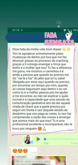 "As sessões com a Elisa fizeram com que eu quebrasse correntes, fazendo com que eu me enxergasse em todos os sentidos... Eu consegui descortinar o que não vi sobre mim, a mulher empoderada e a profissional que luta com toda a força, que não tem medo da batalha... O processo de autoconhecimento é recompensador... Somos os autores da nossa própria história, mas existem pessoas/profissionais que fazem com que aprendamos a escrever com qualidade, conteúdo, determinação, objetivando e potencializando nossas capacidades. Amei, ainda mais pelos puxões sem mimimi."