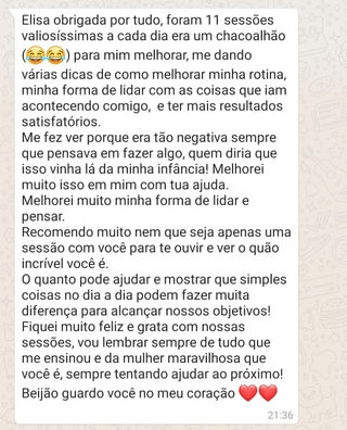 "...Eu entendi que existe muito mais entre o meu querer e a minha ação, existe a minha mente, meu interior carregado de experiências e vivências familiares que me tornaram o que sou hoje e que as cobranças e as expectativas depositadas em mim são apenas o que eu reflito em mim mesma... A Elisa me conduziu para acessar todos esses comportamentos (em sessões não muito fáceis, repletas de emoções, mas tudo necessário) e agora com todo esse conhecimento eu consigo entender, evoluir e seguir em paz, pois eu sei o que posso me permitir ou não, aprendi sobre limites, amor próprio e doação..."